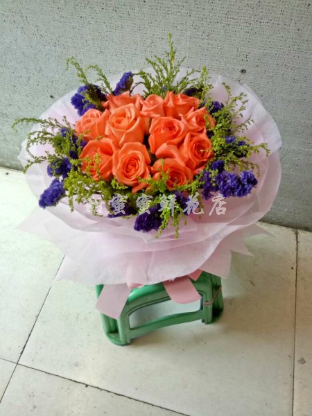 11朵粉玫瑰,水仙百合(或黄莺或满天星)适量点缀,粉色或紫色勿忘我丰满外围。