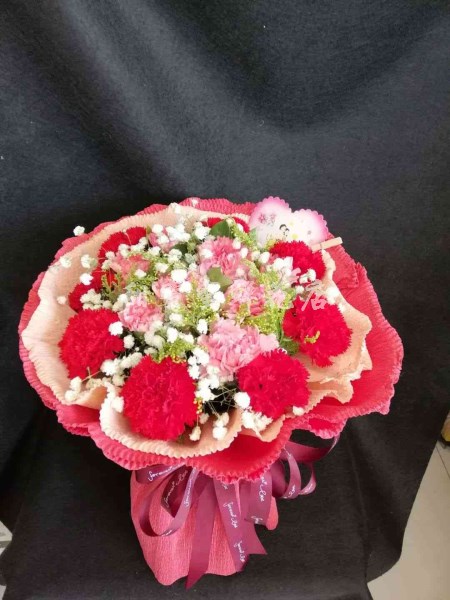 8只红色康乃馨,8只粉色康乃馨。满天星,黄莺