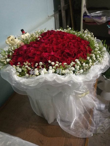 99枝红玫瑰,黄莺、满天星外围,随机赠送两只可爱小公仔