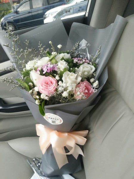 7朵白玫,2朵戴安娜,情人草、满天星、栀子叶