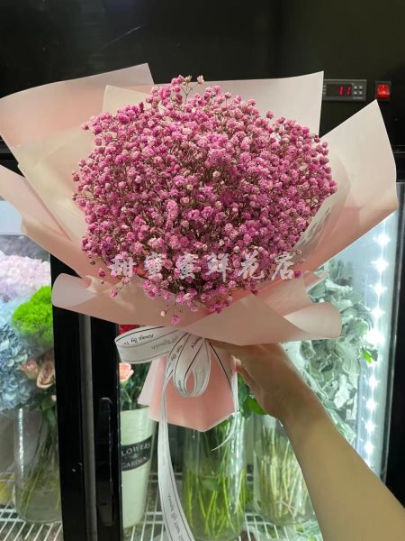白色雾面纸+粉色雾面纸韩式扇形包装,精美咖啡色条纹丝带蝴蝶结束扎。