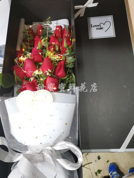 19枝红玫瑰 ,洋甘菊、尤加利搭配、灯串装饰